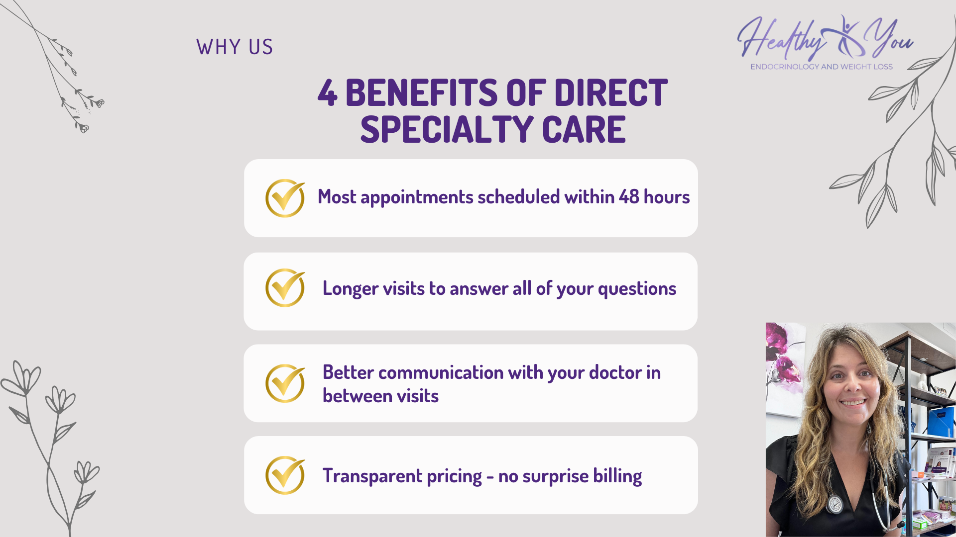 Get the expert care you deserve from a physician triple board-certified in endocrinology, obesity medicine, and menopause. No more guesswork. No more second-guessing. Just a trusted partner committed to your health — guided by the latest evidence and focused entirely on you.